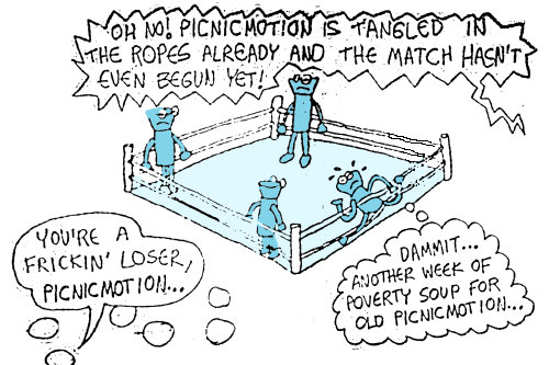 Next, we need to define our four simulated annealing functions... In the left corner, picnicEnergy tells us the overall happiness of our picnic population... smaller, low energy values mean greater happiness. In the right corner, picnicMotion swaps two neighbors randomly to cause motion. In the front corner, (This is a tag-team match) picnicTemperature gives the current temperature: We want to start hot, then cool things down so that our picnic crystalizes in a controlled manner. And finally, in the back, picnicTransitionProbability takes the current temperature and the energy of two states and calculates the likelihood a transition into the new state will occur. For more info, consult you know what... ![]() |
